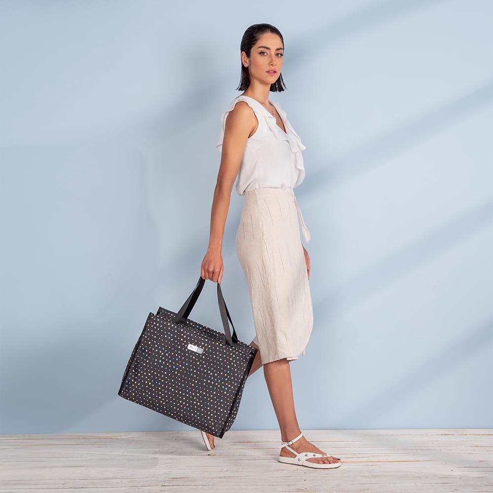 É uma bolsa extremamente prática, a estampa dá o charme e exclusividade para essa linha, o interior impermeável e o revestimento térmico são características essenciais.