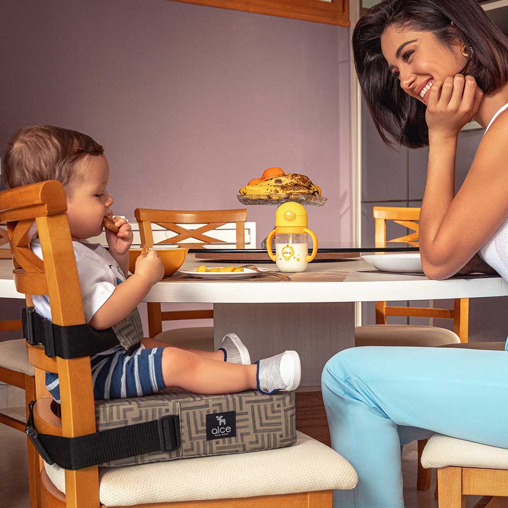 O assento auxilia nesse momento incluindo a criança a mesa da família, pois uma das formas mais efetivas de aprendizagem para o bebê é a imitação.