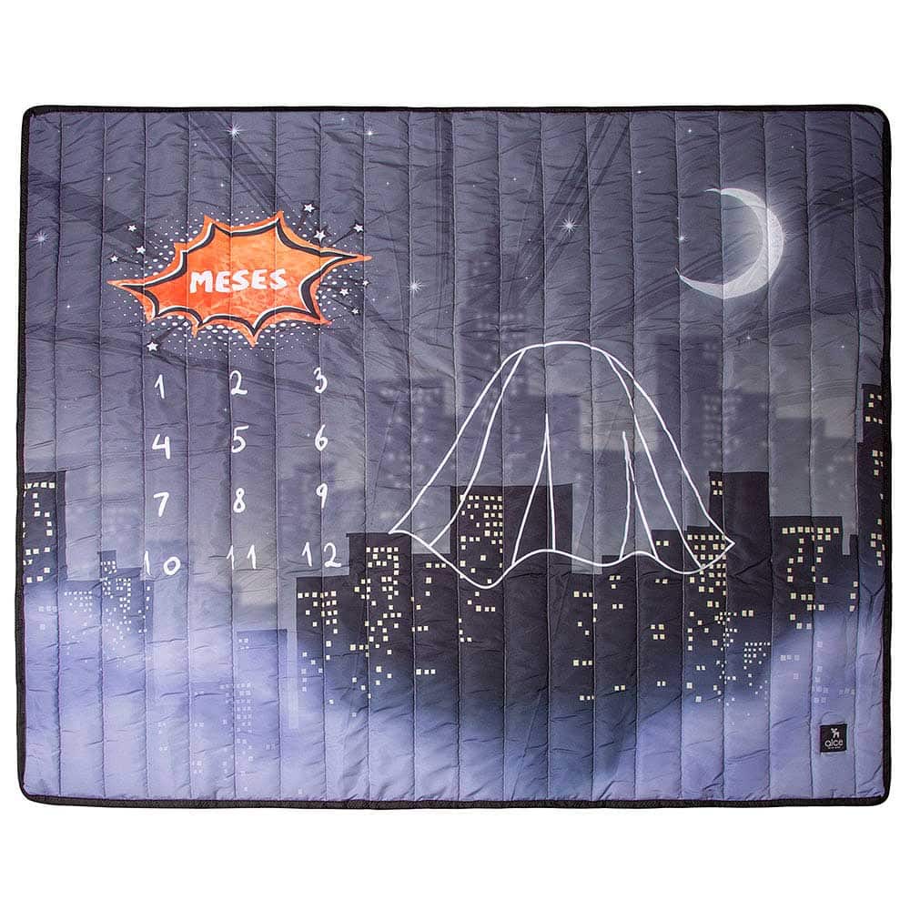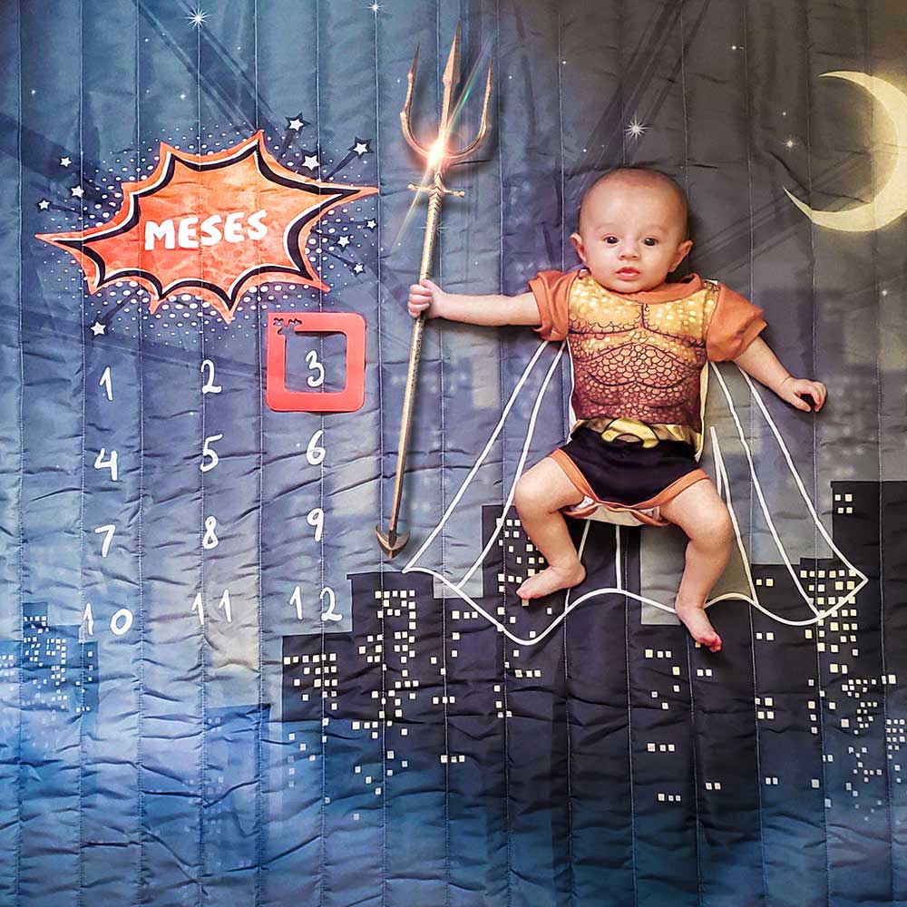 O tapete mesversário é dupla face, com estampa exclusiva no tema Super Herói, para as famílias que terão AMOR e DIVERSÃO em dobro!