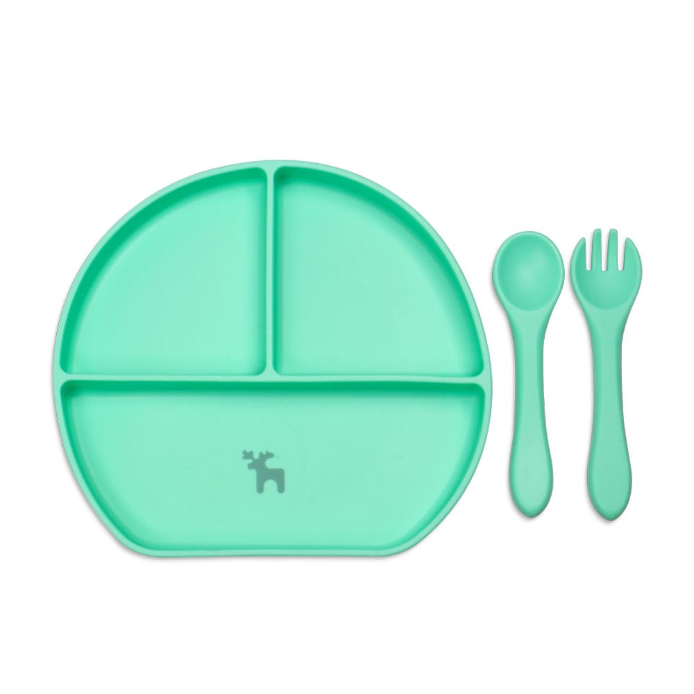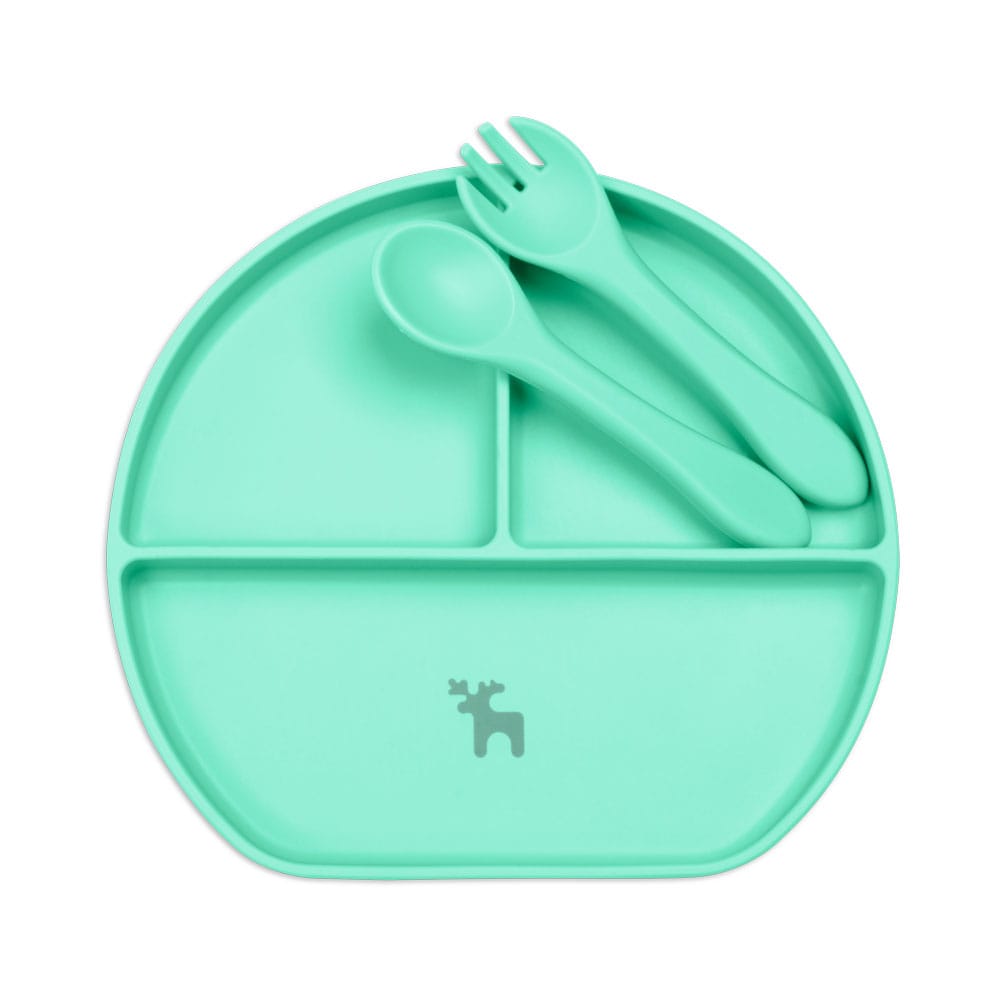 - O pratinho possui 3 divisórias e uma ventosa para fixação na mesa
