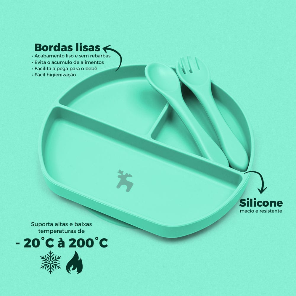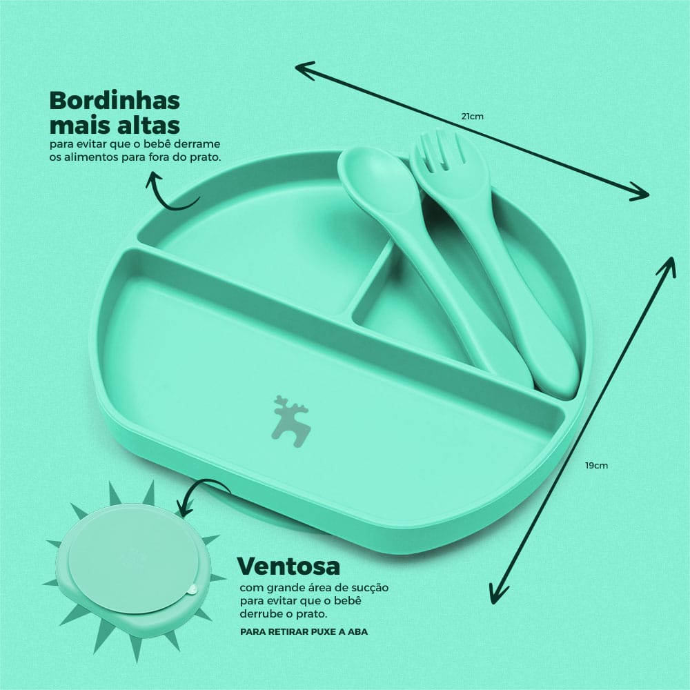 Os pratos e talheres para bebês geralmente vêm em tamanhos apropriados e com divisórias, ajudando a controlar as porções e dividir por tipo, cores e texturas, facilitando o conhecimento e a escolha do bebê.