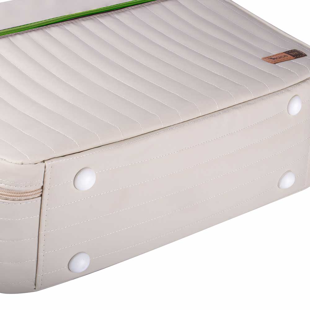 O material é composto por Policloreto de vinila, tecido sintético e as alças são de poliéster, o acabamento é em matelassê. As medidas são: 33cm altura x 47cm comprimento x 15cm largura;