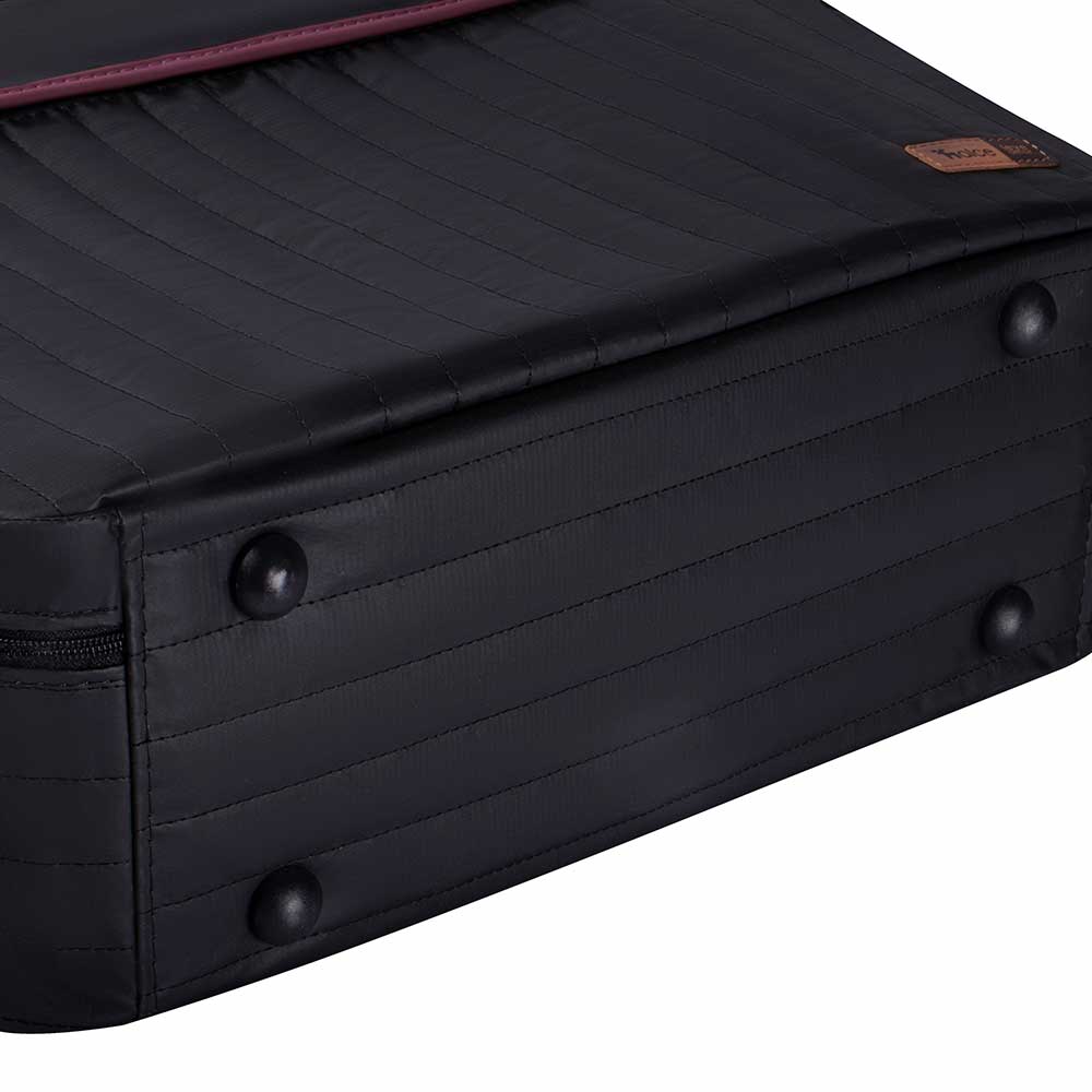 O material é composto por Policloreto de vinila, tecido sintético e as alças são de poliéster, o acabamento é em matelassê. As medidas são: 33cm altura x 47cm comprimento x 15cm largura;