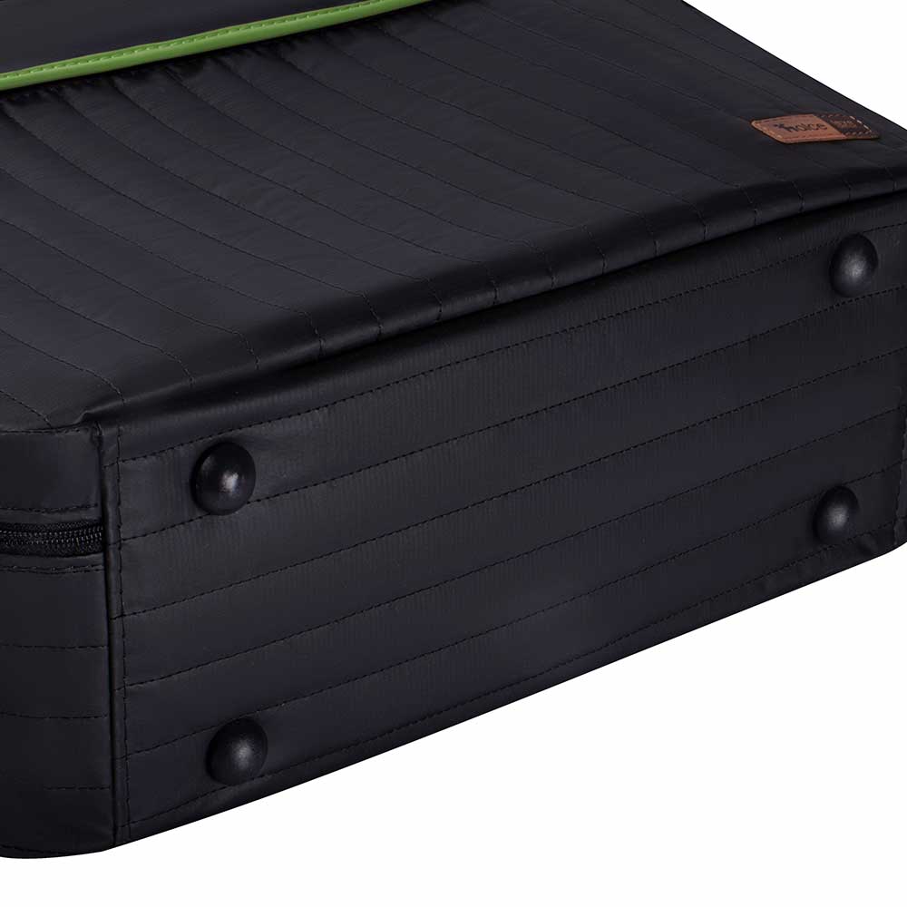 O material é composto por Policloreto de vinila, tecido sintético e as alças são de poliéster, o acabamento é em matelassê. As medidas são: 33cm altura x 47cm comprimento x 15cm largura;
