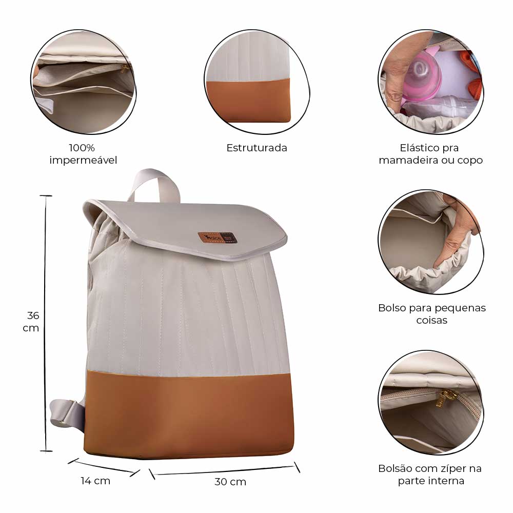 Mochila com design moderno e fácil de usar, que combina com qualquer look, possui alça ajustável e fechamento com botão de fecho magnético, no interior existe dois compartimentos, um com zíper e outro sem, que pode ser usado para separar alguns itens, possui também um elástico para prender garrafinha ou mamadeira, o tecido é 100% impermeável. A mochila maternidade é de uso essencial no cotidiano da mamãe e do bebê, pode ser usada em passeios, ida ao pediatra ou na casa da vovó e do vovô; o espaço dela é bem amplo, e cabe bastante coisa, pode colocar de uma ou duas troquinhas de roupas, trocador, comidinhas e fraldas por exemplo.