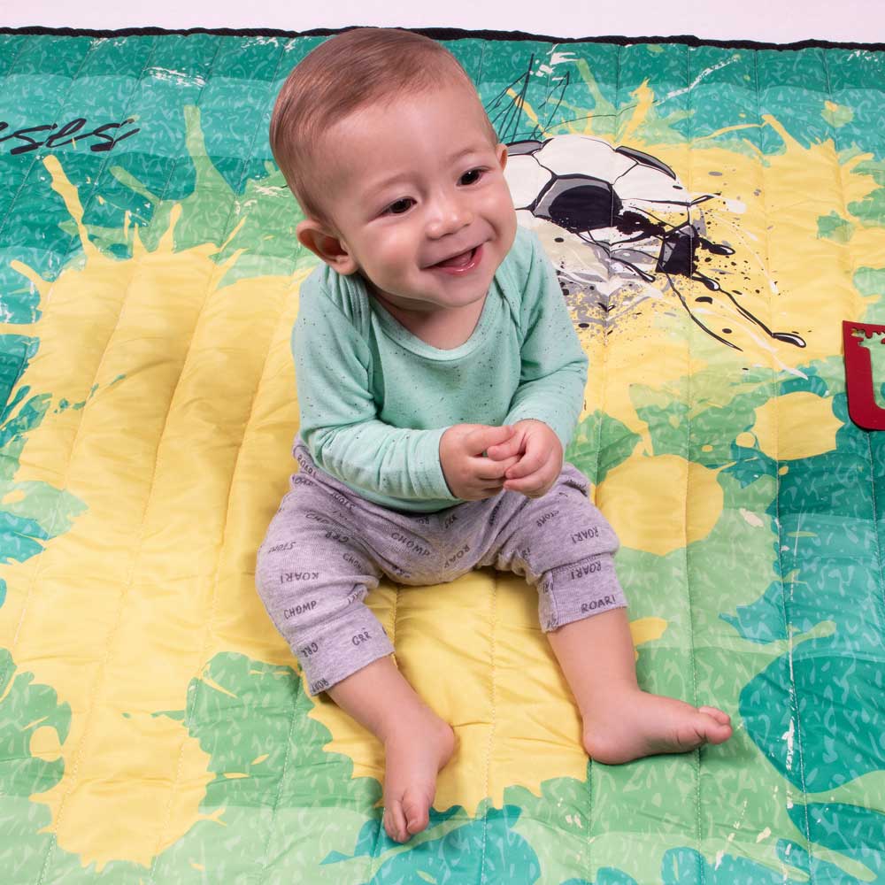 O tapete mesversário é dupla face, com estampa exclusiva no tema Futebol, para as famílias que terão AMOR e DIVERSÃO em dobro!