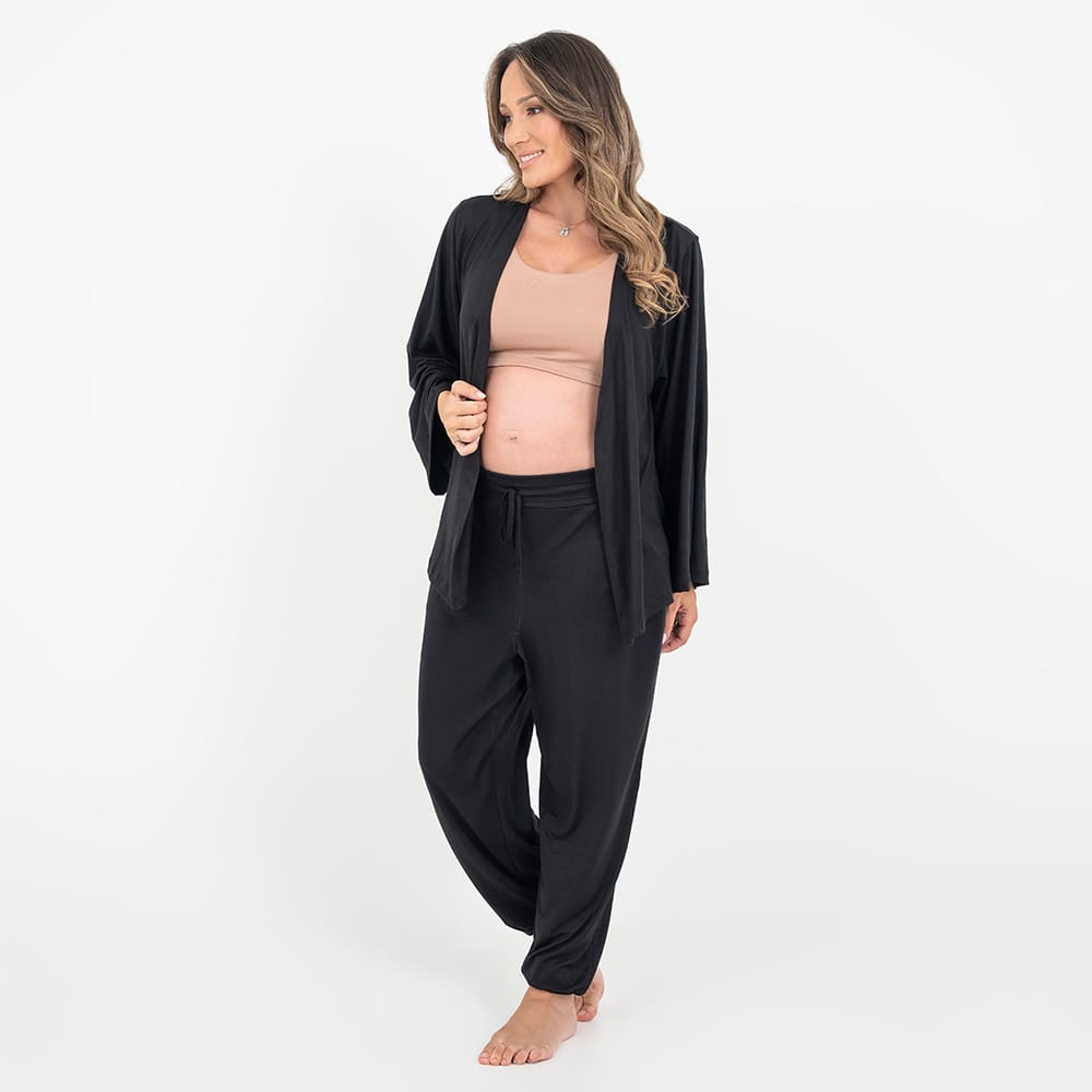 Modelagem longa e fluida – perfeita para os dias mais frescos, sem perder a leveza e o conforto necessários para a maternidade.
