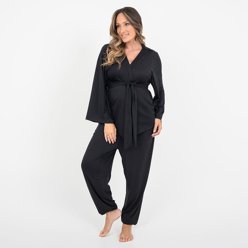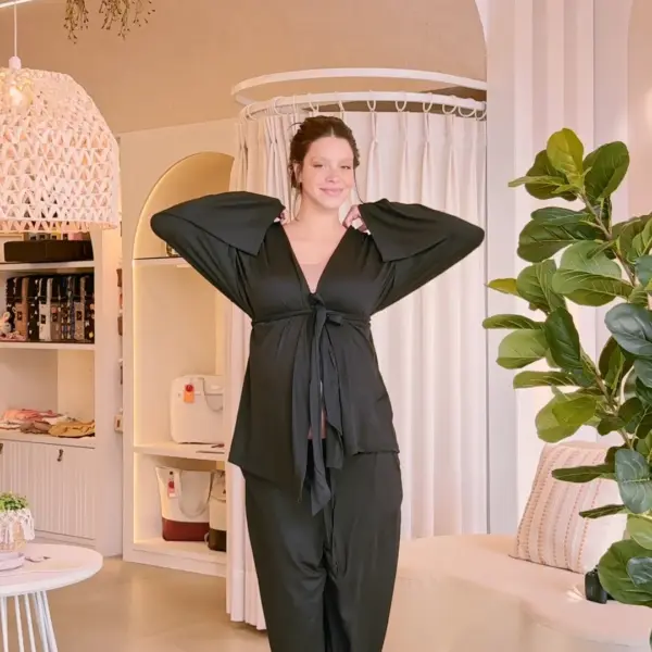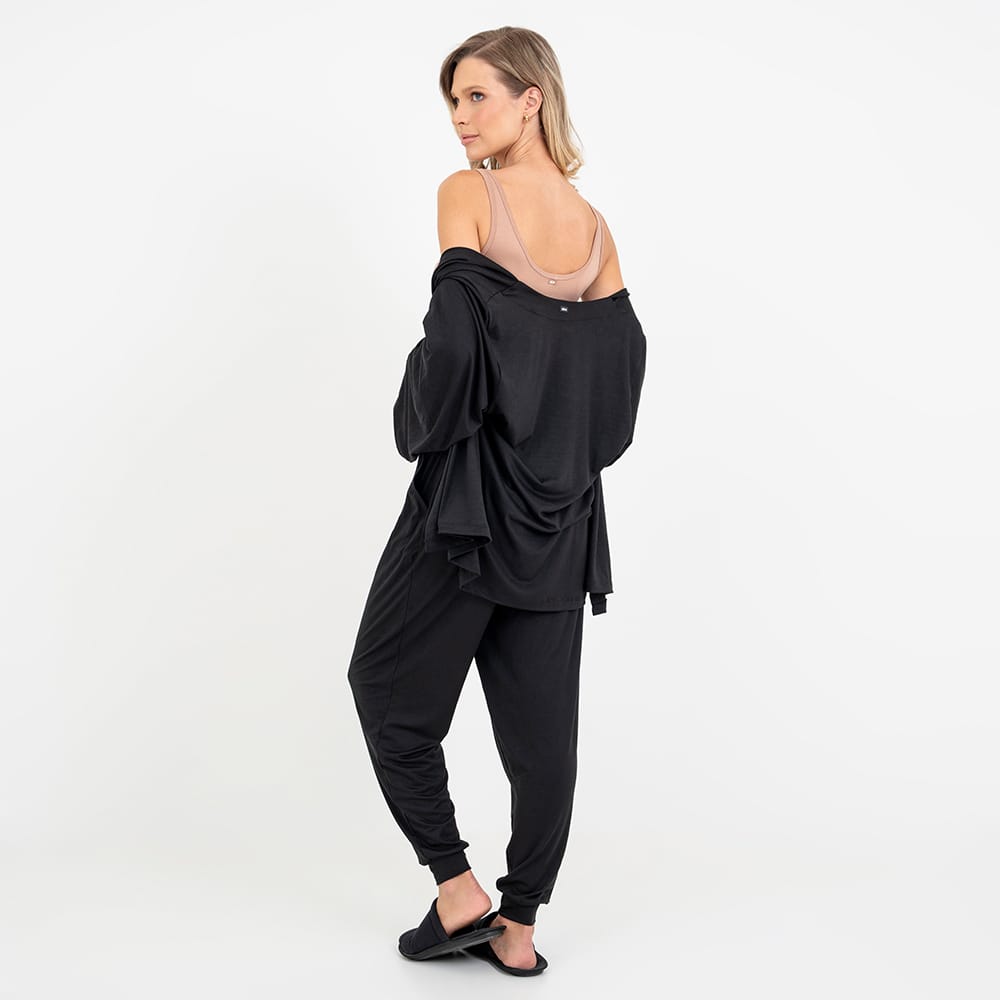 O comprimento longo do Trijunto Longo Maternidade Preto e Cappuccino é perfeito para as meias-estações e o inverno, garantindo aconchego sem abrir mão da leveza, permitindo também combinações com outras peças. Um pijama refinado que se transforma facilmente em um look casual sofisticado, ideal para mamães que desejam unir elegância e funcionalidade no dia a dia.